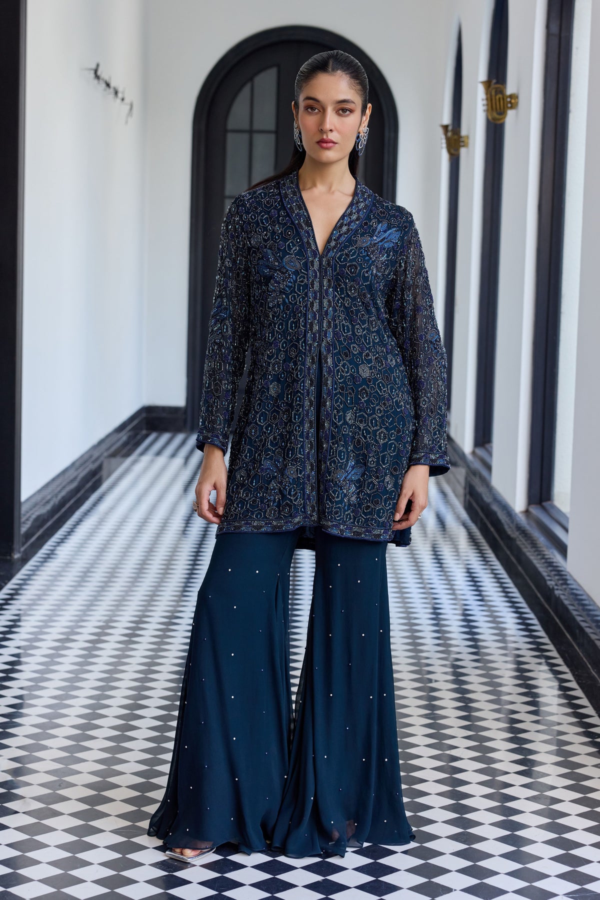 Featuring collar neck front open embellished abstract art with bee motifs jacket paired with flared pants