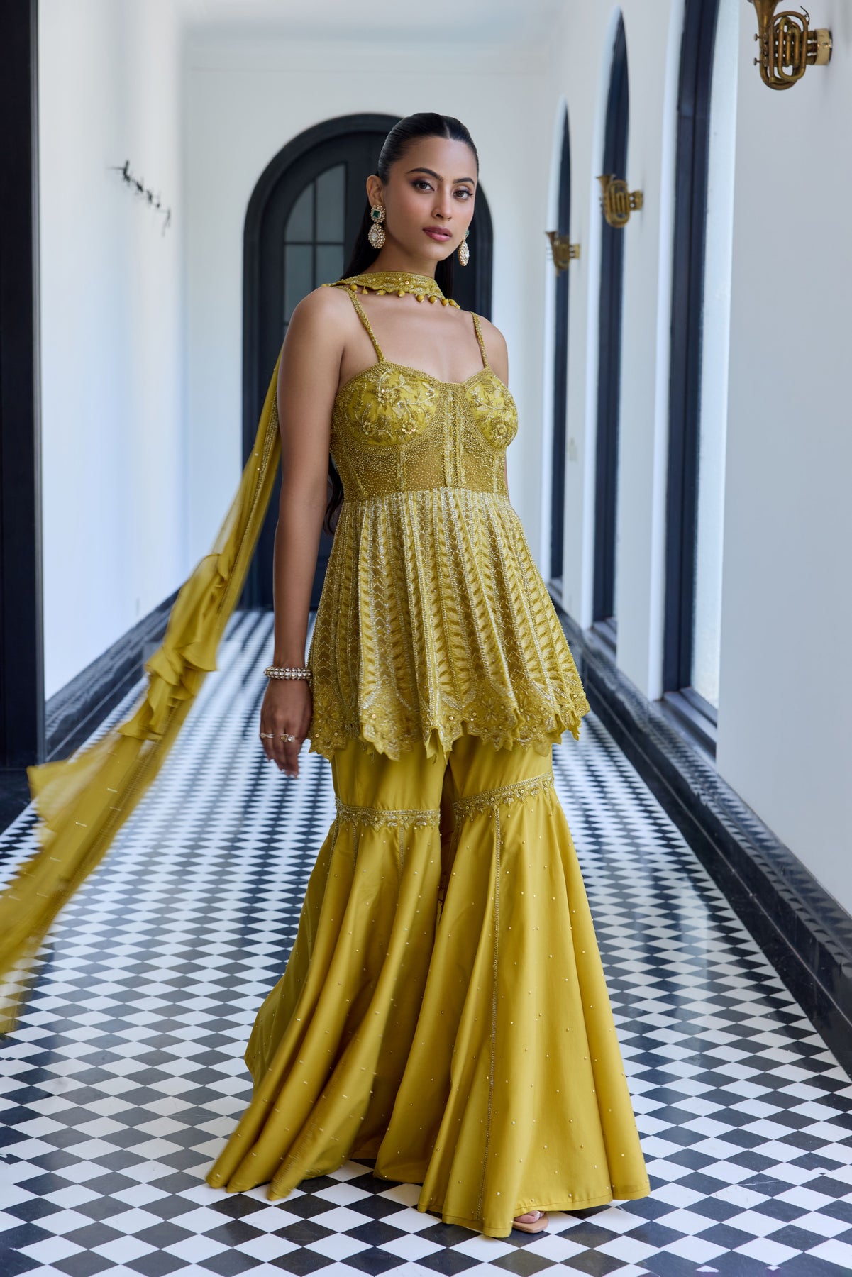 Featuring Strappy corset kali peplum paired with flared sharara pants & net dupatta