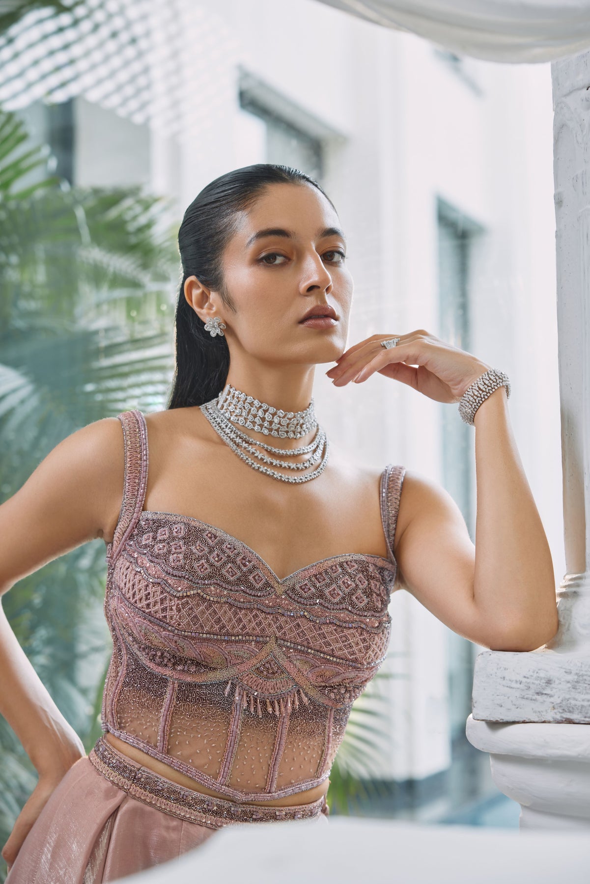 Featuring sweetheart neck embellished corset paired with flared lehenga & net dupatta.